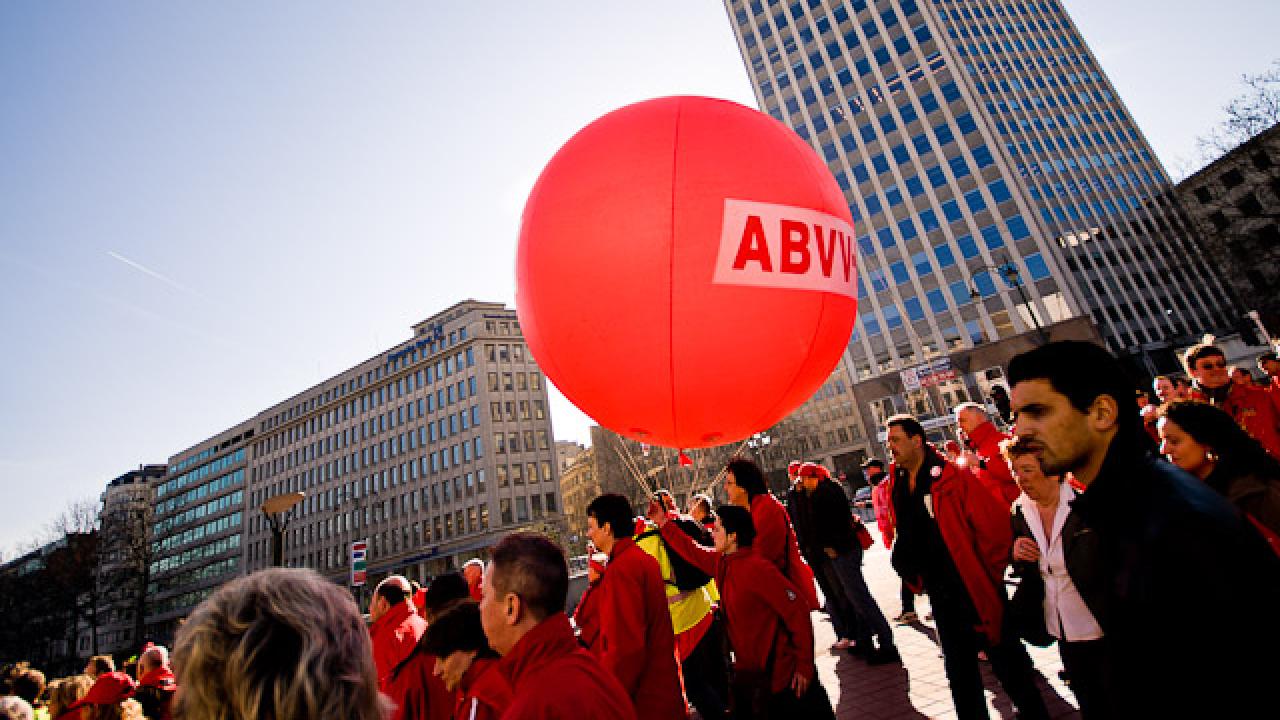 Helikoptrar rör sig i cirklar på den blåa himlen ett par hundra meter ovanför det helröda demonstrationståget på Boulevard de Waterloo i Bryssel. Nere på marken går Raf Verbeke från den nordbelgiska staden Gent och delar ut flygblad. Han och 8 000 medlemmar i det socialistiska fackförbundet FGTB strömmar långsamt framåt den breda avenyn med EU-rådsbyggnaden Justus Lipsius som slutmål.